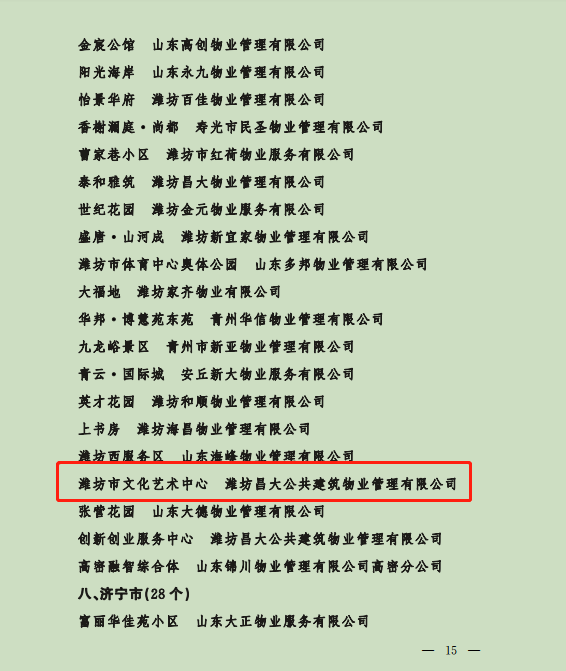 9月3日,山東省住房和城鄉(xiāng)建設(shè)廳公布關(guān)于品牌建設(shè)典型示范案例和“質(zhì)量標桿”項目(第二批)名單,我公司作為品牌建設(shè)典型示范案例予以公布、服務(wù)管理的濰坊市文化藝術(shù)中心和峽山區(qū)創(chuàng)新創(chuàng)業(yè)服務(wù)中心同時獲得質(zhì)量標桿項目。