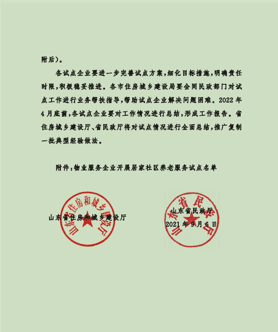 2021年9月6日,山東省住房和城鄉建設廳、山東省民政廳聯合公布了關于物業服務企業開展居家社區養老服務試點名單,我公司在首批試點名單之列。